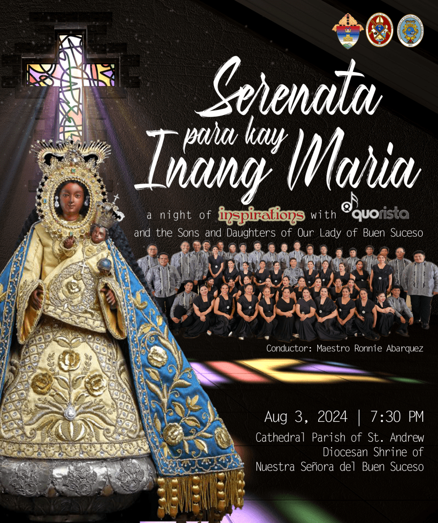 Experience an evening of heavenly melodies and spiritual devotion with "Serenata para kay Inang Maria," featuring Quorista and the Sons and Daughters of Our Lady of Buen Suceso. This uplifting event will take place on August 3, 2024, at St. Andrew Cathedral-Parish in the Diocese of Parañaque, starting at 7:30 PM. Admission is free, and seats are available on a first-come, first-served basis.