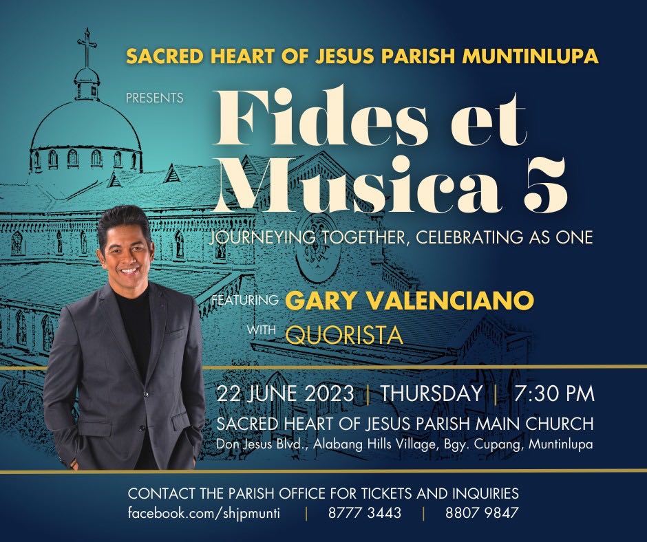 𝐅𝐢𝐝𝐞𝐬 𝐄𝐭 𝐌𝐮𝐬𝐢𝐜𝐚 𝟓 𝐰𝐢𝐥𝐥 𝐟𝐞𝐚𝐭𝐮𝐫𝐞 𝐭𝐡𝐞 𝐦𝐮𝐥𝐭𝐢-𝐚𝐰𝐚𝐫𝐝𝐞𝐝 𝐬𝐢𝐧𝐠𝐞𝐫 𝐆𝐚𝐫𝐲 𝐕𝐚𝐥𝐞𝐧𝐜𝐢𝐚𝐧𝐨, 𝐰𝐢𝐭𝐡 𝐨𝐮𝐫 𝐨𝐰𝐧 𝐐𝐮𝐨𝐫𝐢𝐬𝐭𝐚 𝐚𝐬 𝐭𝐡𝐞 𝐟𝐫𝐨𝐧𝐭 𝐚𝐜𝐭. 𝐓𝐡𝐞 𝐜𝐨𝐧𝐜𝐞𝐫𝐭 𝐢𝐬 𝐨𝐧 𝐉𝐮𝐧𝐞 𝟐𝟐, 𝟐𝟎𝟐𝟑, 𝟕:𝟑𝟎𝐏𝐌 𝐚𝐭 𝐭𝐡𝐞 𝐒𝐚𝐜𝐫𝐞𝐝 𝐇𝐞𝐚𝐫𝐭 𝐨𝐟 𝐉𝐞𝐬𝐮𝐬 𝐏𝐚𝐫𝐢𝐬𝐡.