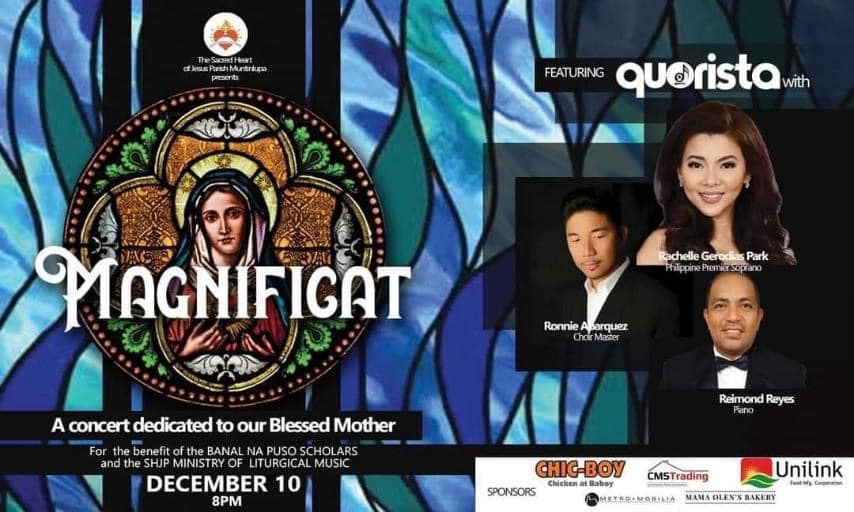 Magnificat Concert – a concert dedicated to our Blessed Mother. Featuring renowned Philippine Premier Soprano, Rachelle Gerodias Park and Quorista with our dear conductor Ronnie Abarquez and Pianist Reimond Reyes.